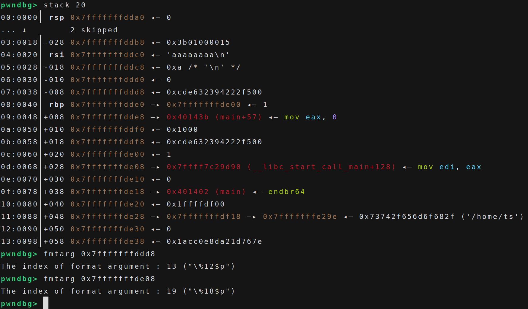 我们可以先利用格式化字符串来泄露出 canary 和 libc,gdb 调试,发现 canary 和 libc 分别在 13 和 19 的位置