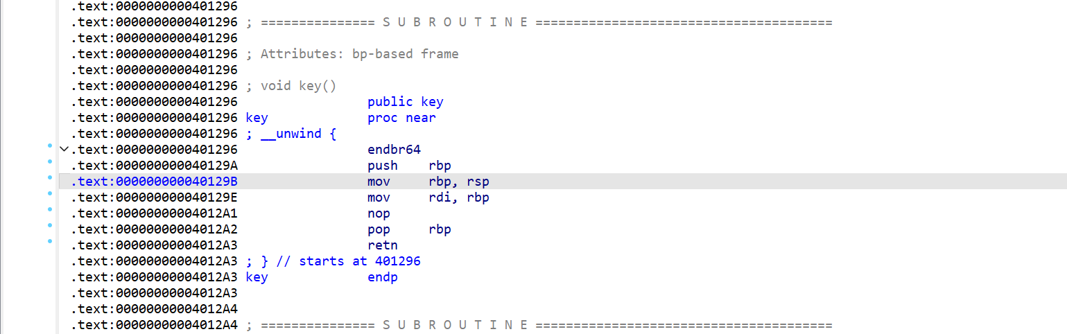 查找 gadget 的时候,并没有发现 rdi 的 gadget 的,不过 key 函数给出了一段 gadget,通过这段 gadget 可以控制 rdi
