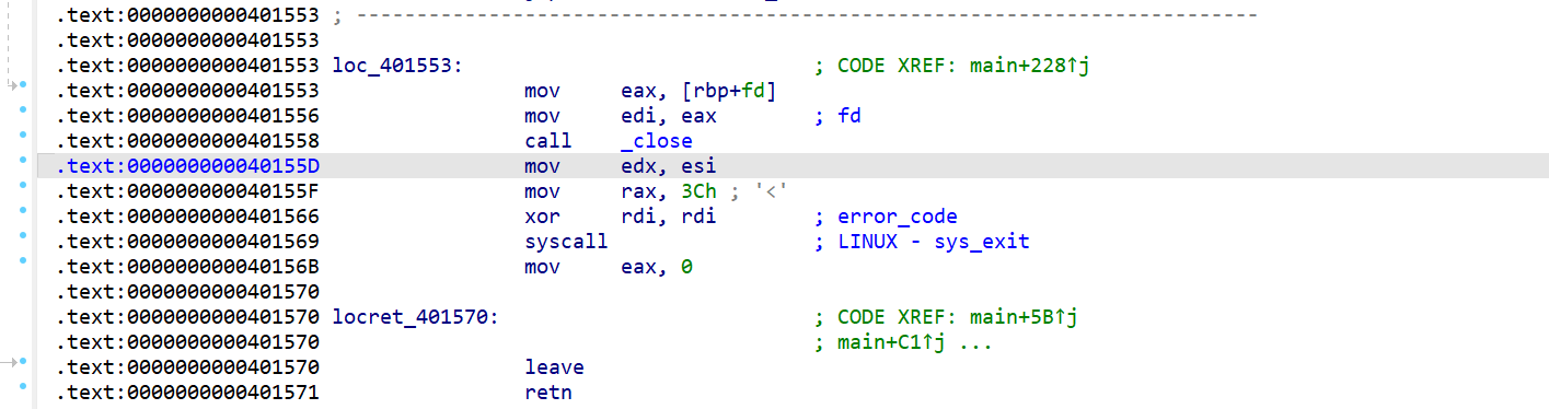 查看其汇编代码,将 mov rax, 3Ch 改成 mov rax, 0 就是可以系统调用 read,从而进行溢出