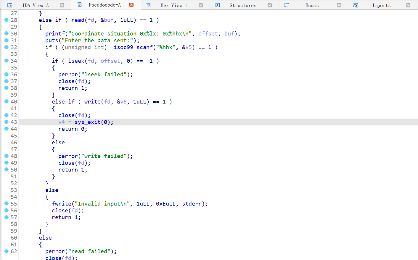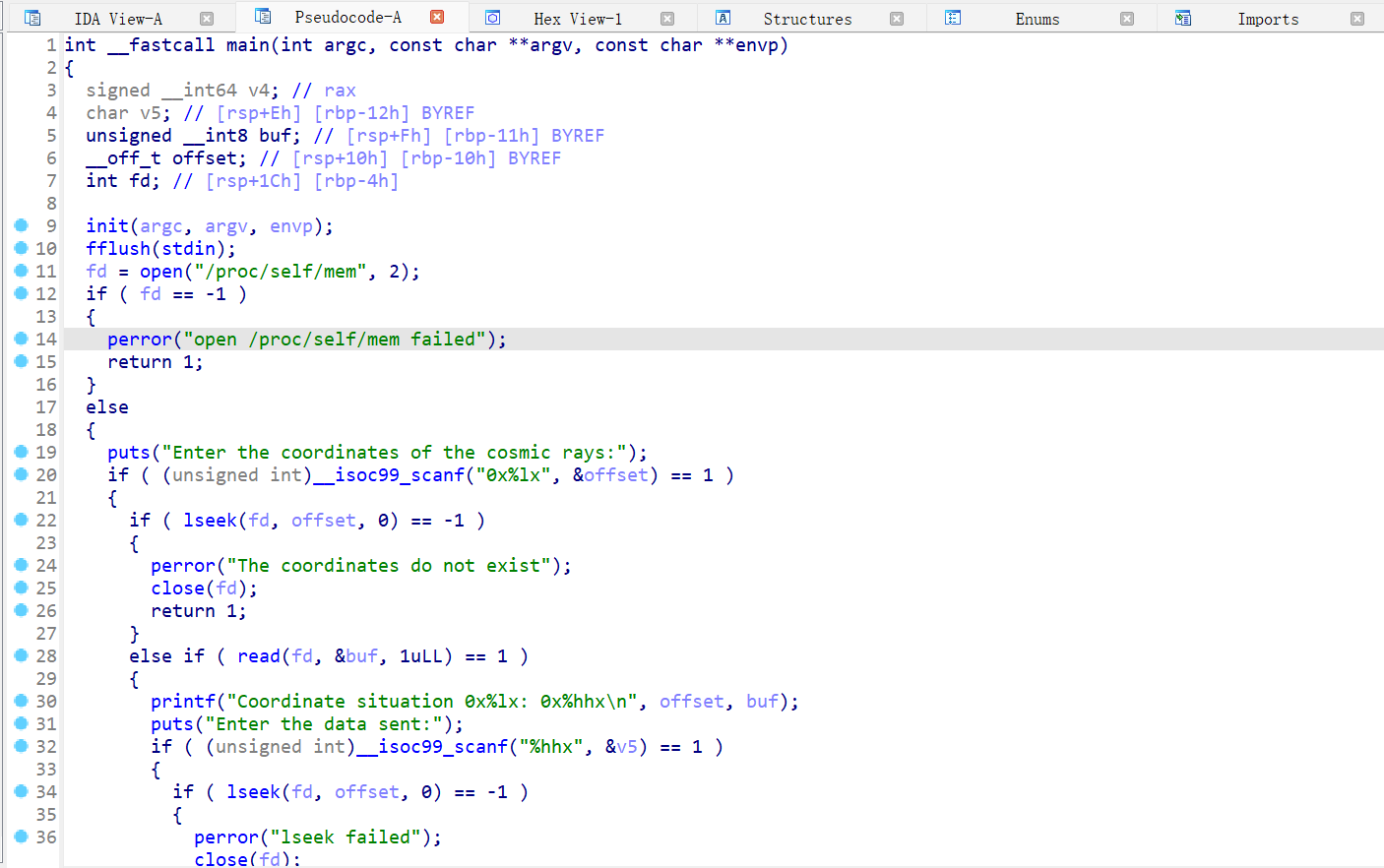 main 函数,打开了一个/proc/self/mem 文件,通过该文件,可以读取或写入进程的内存。第一个输入提示用户输入一个十六进制格式的内存地址,然后/proc/self/mem 文件会根据输入的内存地址进行修改。这里我们还可以注意到,/proc/self/mem 文件关闭后有一个 sys_exit 的系统调用