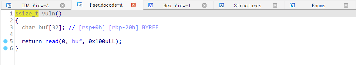 vuln 函数,溢出一个字节,所谓的 off-by-one 漏洞