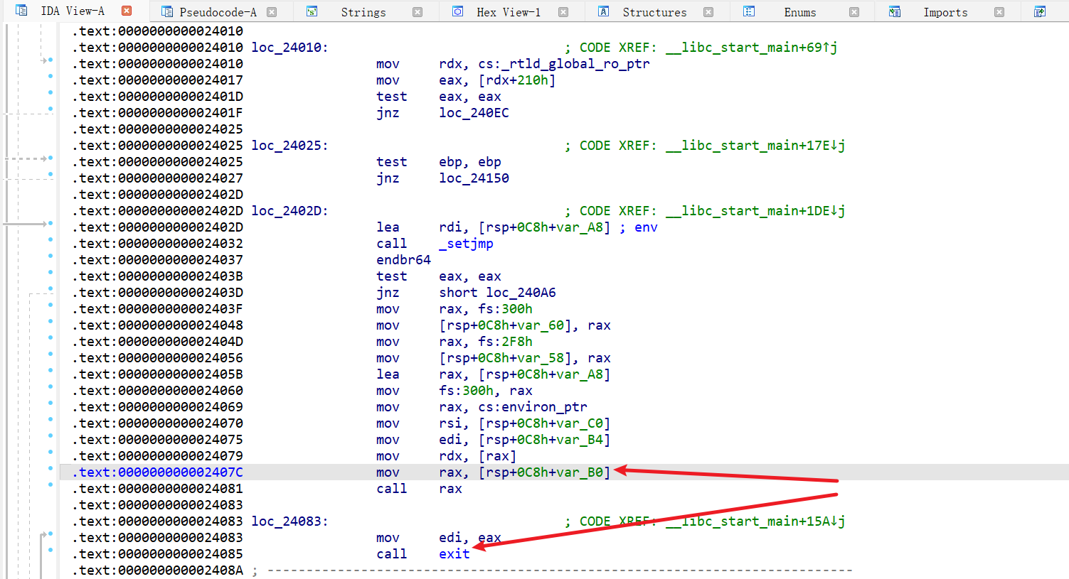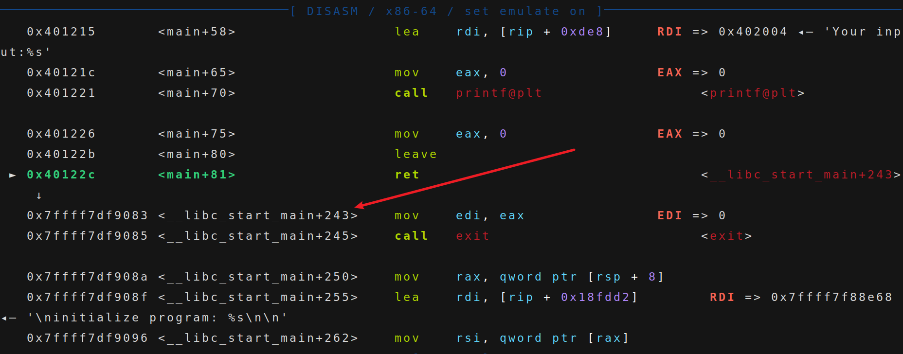 gdb 调试,在 main 函数执行到 ret 之后会进入 __libc_start_main 函数,然后执行 exit 退出。