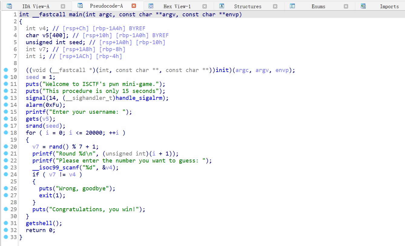 这题是一个伪随机数,总共需要跑 20001 次,最开始的想法是栈溢出控制 seed 的值,但是在循环里面没处理好;后面的做法是先跑 20001 次随机数存到列表中,然后连上远程发送列表里的随机数。