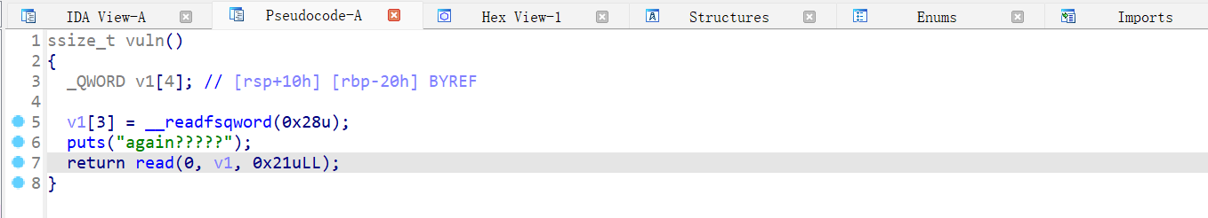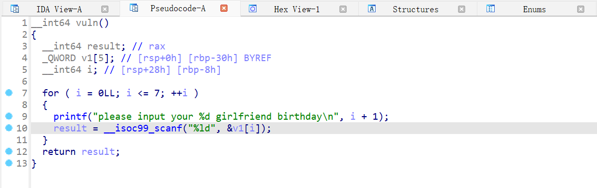 vuln 函数可以栈溢出,for 循环总共 8 次,在第八次输入时可以覆盖返回地址;0-5 是数组 v1,6 是 rbp,7 是返回地址;值得一提的是 i 是在 v1 的范围内,因此输入的值要合理。