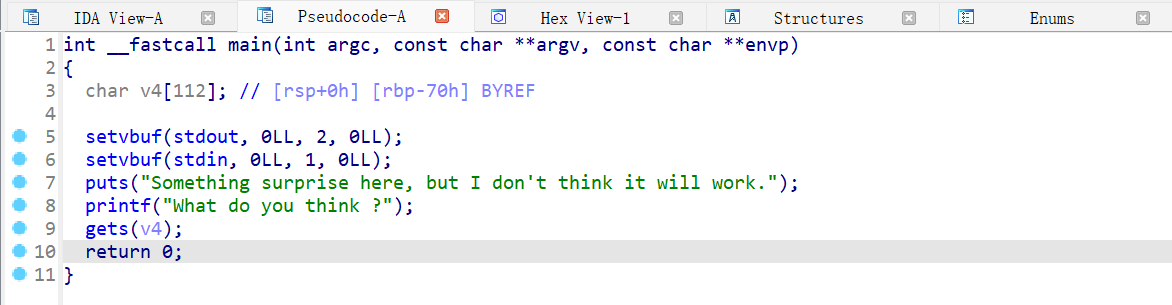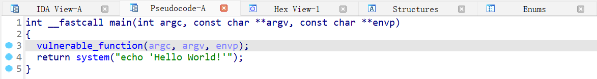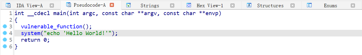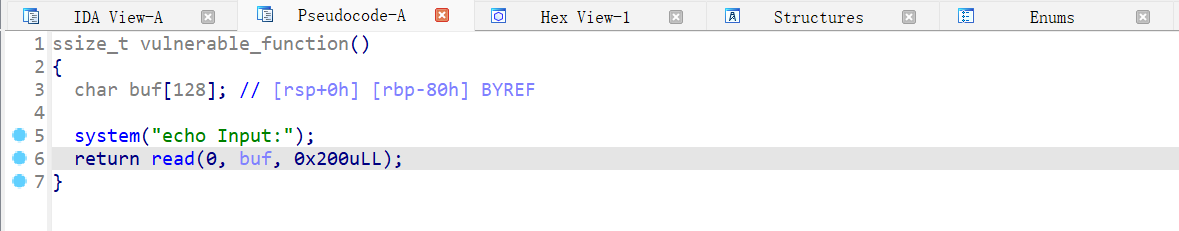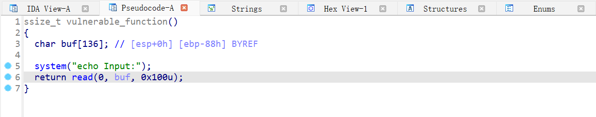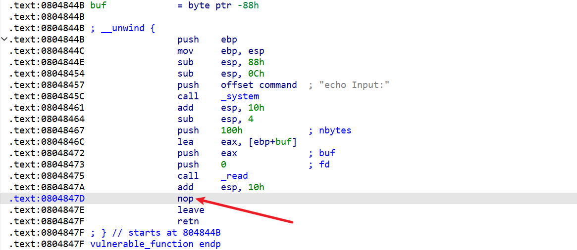 main 函数调用了vulnerable_function,然后是用 system 函数打印,vulnerable_function 函数中存在溢出。