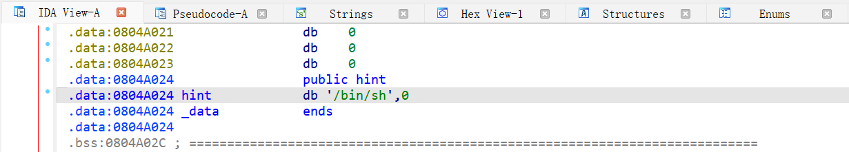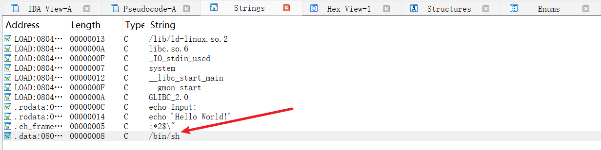 在 ida 中查看 Strings 列表,可以看到有/bin/sh 字符串,双击后可以看到其地址