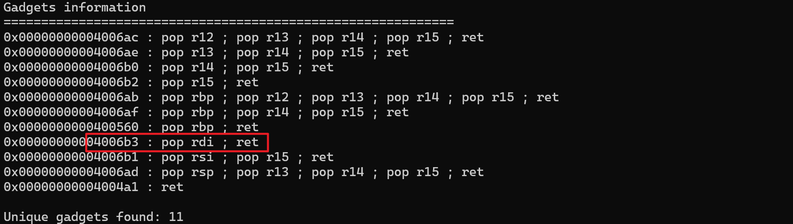 由于程序是 64 位,而 64 位程序传递参数的第一个寄存器是 rdi,因此我们需要寻找一个 rdi 的 gadget