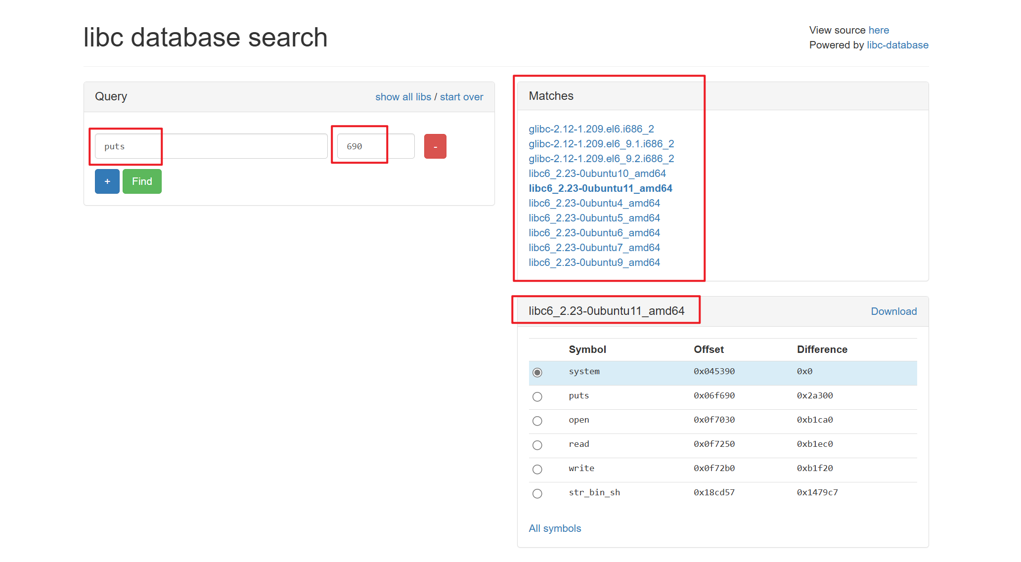 左侧两个输入框,左边输入框输入对应函数,右边输入框输入函数地址结尾的 3 个数字,比如这里我输入的是 puts 以及 690。我们点击 Find 之后右侧就会出现 libc,我们选择其中一个,比如这里我选择 libc6_2.23-0ubuntu11_amd64