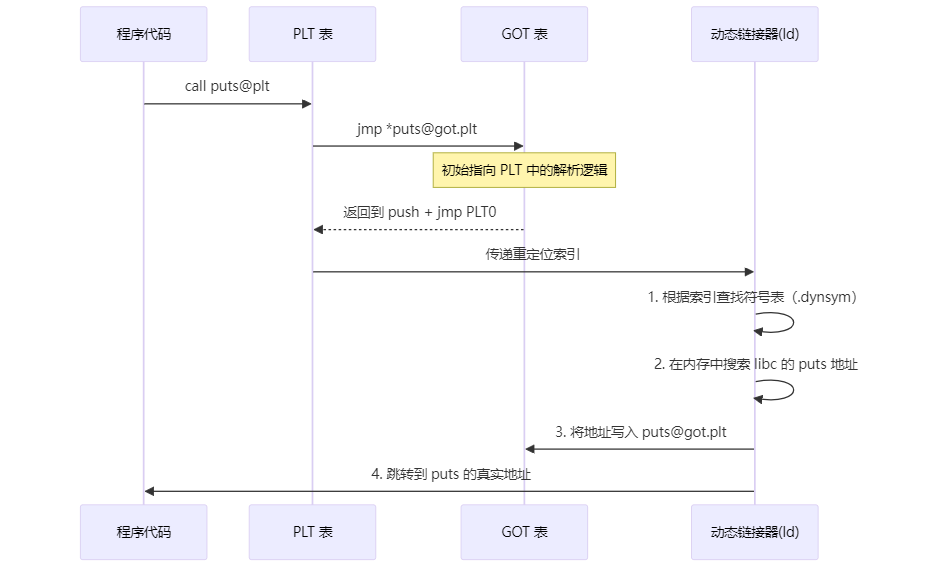 1 2 3 程序调用动态函数 → PLT 引导跳转 → 查询 GOT 表 → ├─ 已解析 → 直接跳转至 libc 函数 └─ 未解析 → 触发动态链接器 → 解析地址 → 更新 GOT → 跳转