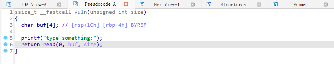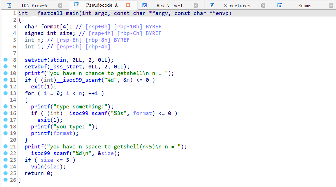 main 函数存在格式化字符串漏洞,次数可以自定义,但是字符数限制在 3 字符以内;之后调用了 vuln 函数,vuln 函数中 size 是自定义,但是 size 在小于等于 5 时才可以调用 vuln 函数,vuln 函数的 buf 大小是 4;我们还可以发现 vuln 函数中 size 是 unsigned int 类型,因此可以造成整数溢出。