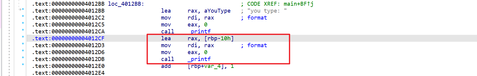 通过仔细查看汇编代码,我们发现有如下部分,这部分就是格式化字符串漏洞 printf(format);可以看到 lea rax, [rbp-0x10]