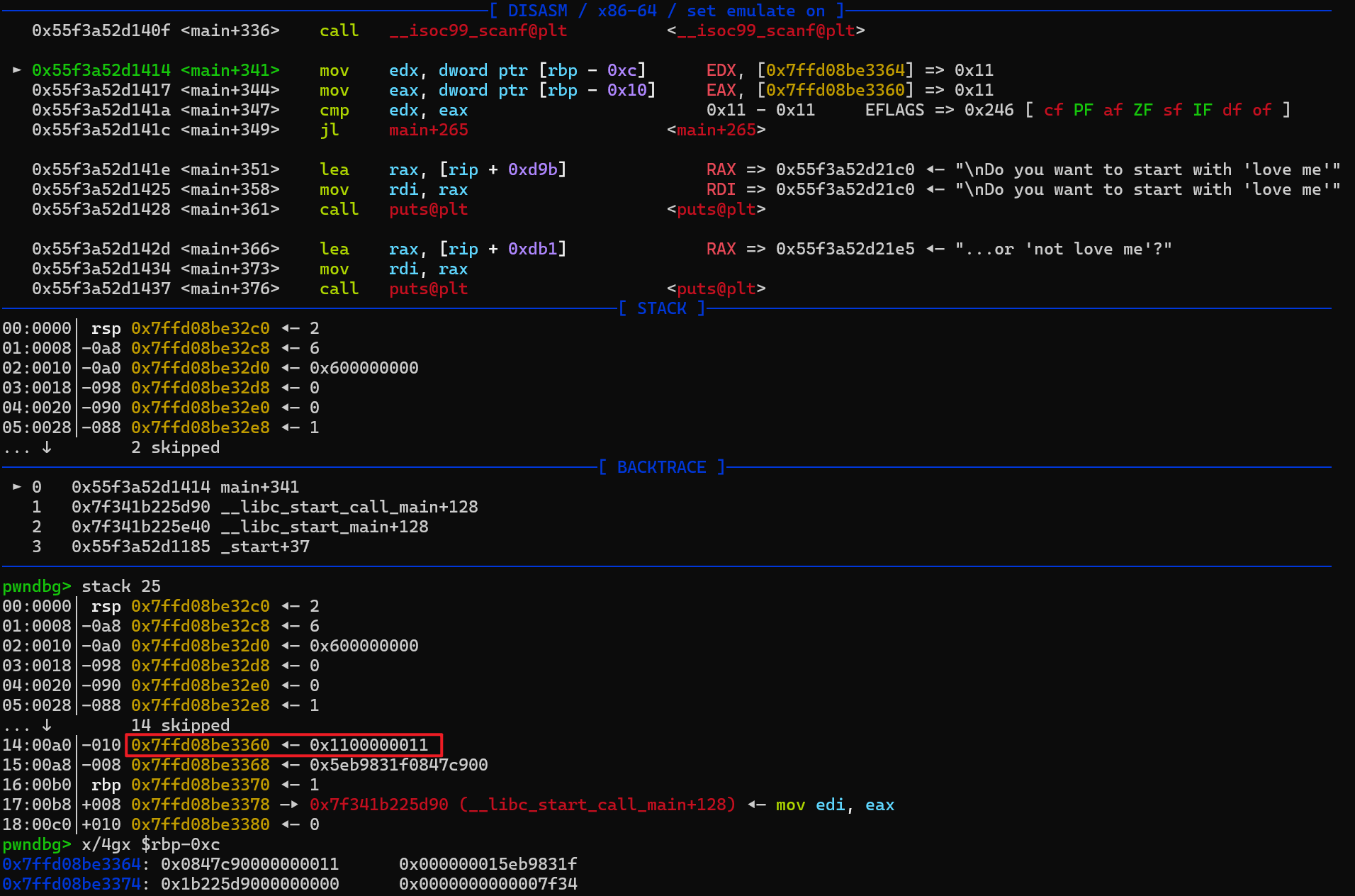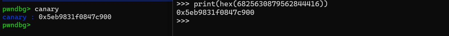 可以看到,rbp-0x10 的位置被覆盖成了0x1100000011;在打印的数值中,我们可以看到十进制的 canary 数值,将其转换 16 进制,确实是 canary