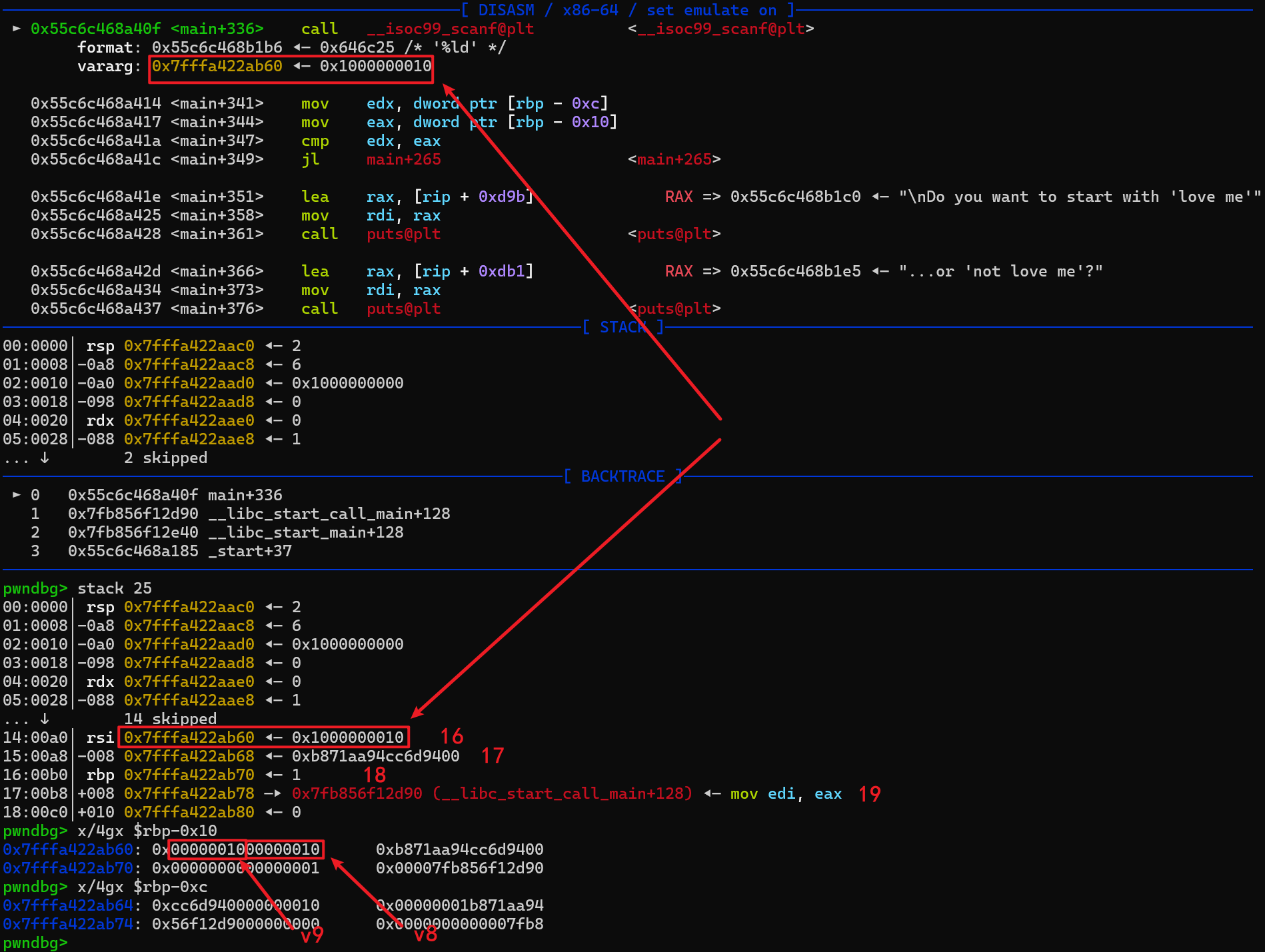 经过调试,在第 16 次输入的时候,输入的位置是 rbp-0x10,我们知道 v8 是 rbp-0x10、 v9 是 rbp-0xc,这两个变量都是四字节,那么在 rbp-0x10 位置的前四字节是 v9,后四字节是 v8, 因此第 16 次输入可以同时覆盖 v8 跟 v9;然后我们以此类推,canary 是 17,rbp 是 18,rbp+8 是 19。