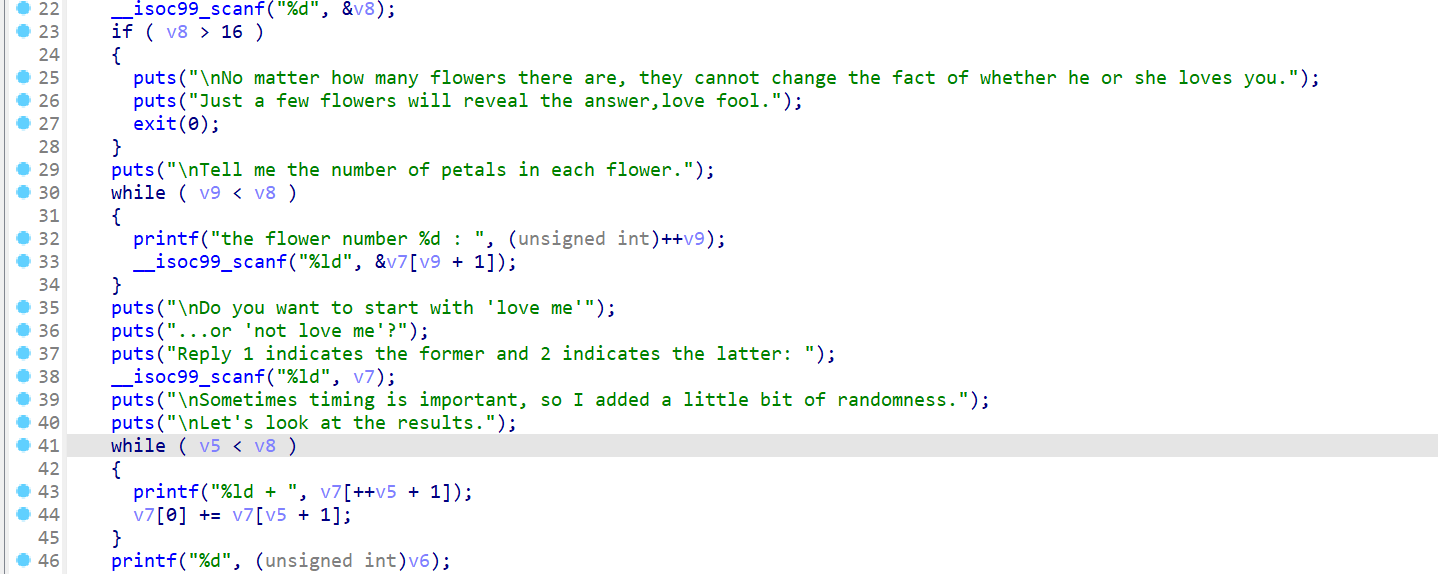 如果我们只增加后四字节的数值,即0x1000000011,这样就将 v8 覆盖成 0x11,而此时 v9 是 0x10,那么 v9 小于 v8 就会增加一次输入,在后面比较 v5 和 v8 进入循环就会打印第 17 次的内容。如果我们同时修改前后四字节,例如0x1100000011,这样就将 v9 和 v8 都覆盖成了 0x11,那么 v9 等于 v8 就不会有输入。