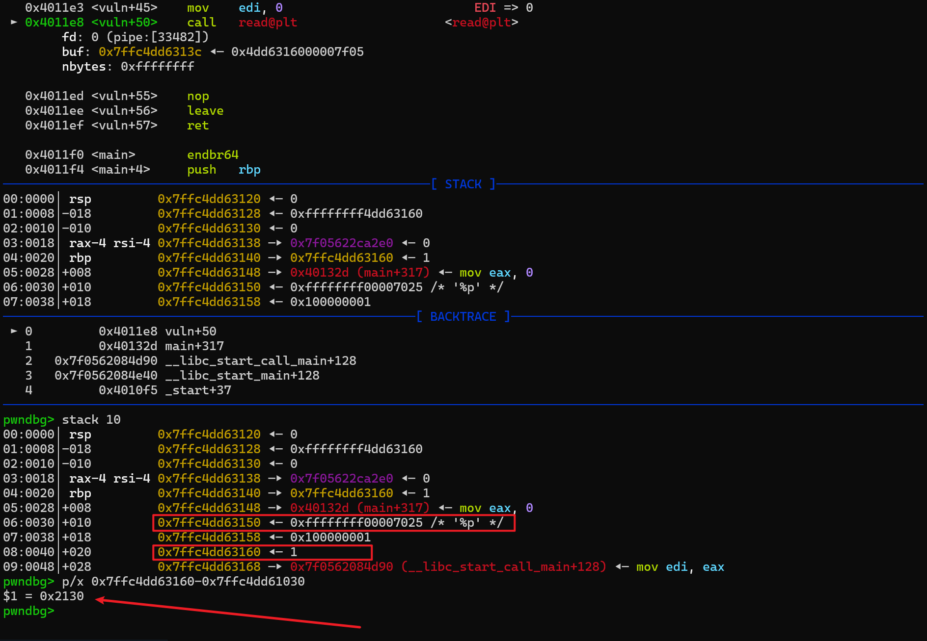 gdb 调试,可以看到在返回地址的下方,即 rbp+0x10 的位置,我们可以放参数%9$p;我们要将这个位置在返回之后变成 rbp-0x10,那么返回后的 rbp 就必须是当前 rbp+0x20 位置的地址,我们可以计算出泄露出的栈地址到这个地址的距离,计算出距离是 0x2130