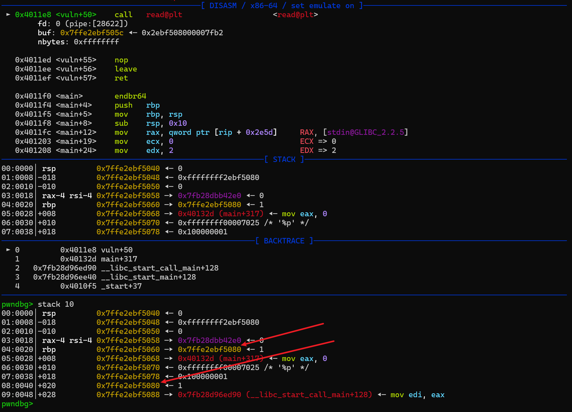 可以看到,此时返回的 rbp 已经变成了当前 rbp+0x20 的地址(这里可能会失败,需要多试几次)